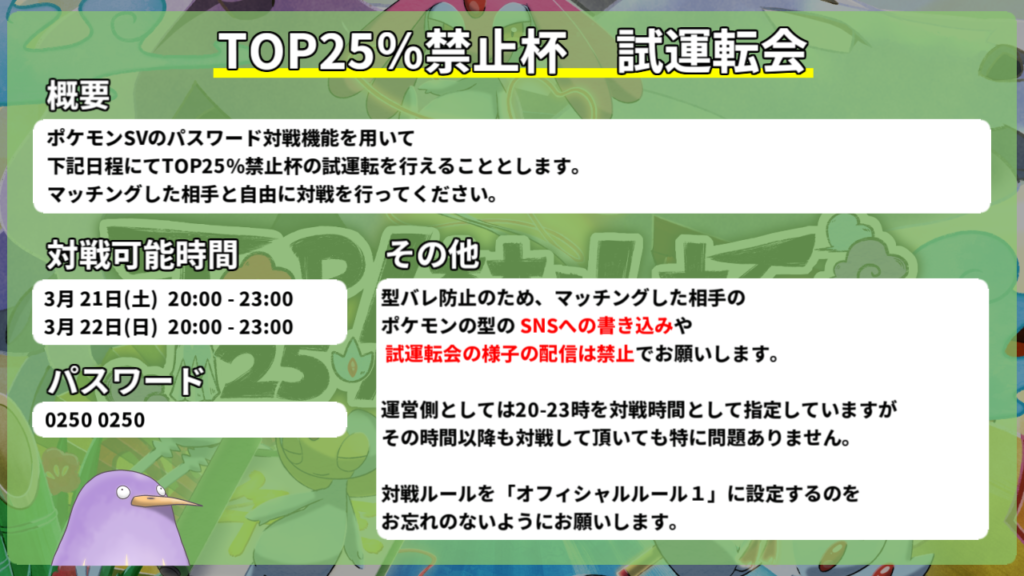 ・開催当日までに構築の試運転をしたい!という方もいると思いますのでツイッターにてハッシュタグ #25P禁止杯 を使って参加者同士で自由に対戦の募集を行えることとします。(ハッシュタグに%使えませんでした・・・)